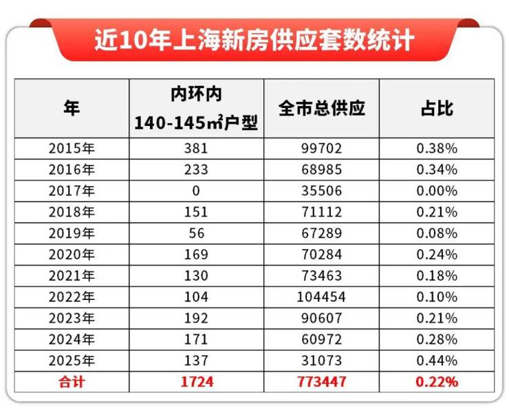 静安内环占全市面积约1.8%,却集聚了全市约8.58倍教育资源、约11.84倍医疗资源、约6.34倍商业资源(数据来源:《上海统计年鉴》)。根据近10年上海新房供应数据统计,静安内环内建面约112-143㎡三四房户型供应呈现明显的稀缺性特征。
