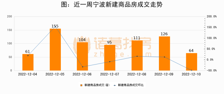 根据宁波市房产市场管理中心数据显示,2022年12月10日宁波新建商品房成交64套,较昨日减少62套,环比下降49.2%