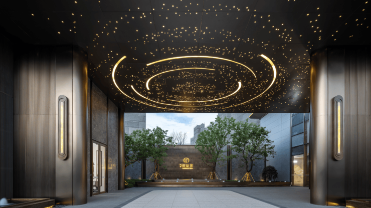 项目北区的社区归家主入口, 景墙取自“水”和“鱼”的元素 ,诗意静谧、南区入口归家大堂,联动地下采光会所;