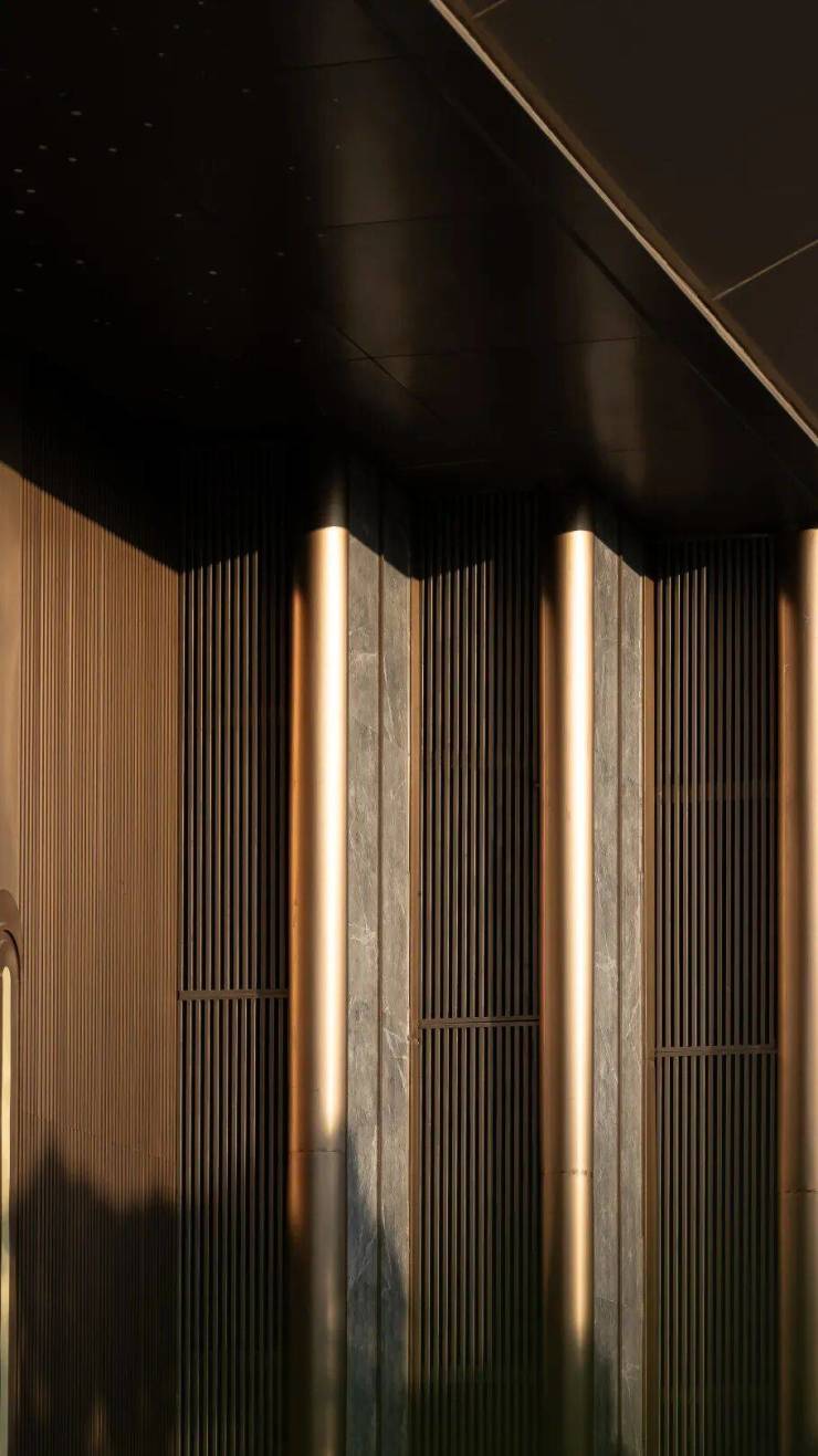 其中大门立面 金属 与 仿石材 搭配设计,金属格栅细节丰富,仿石材纹理清晰,颇有豪宅的气质和质感。