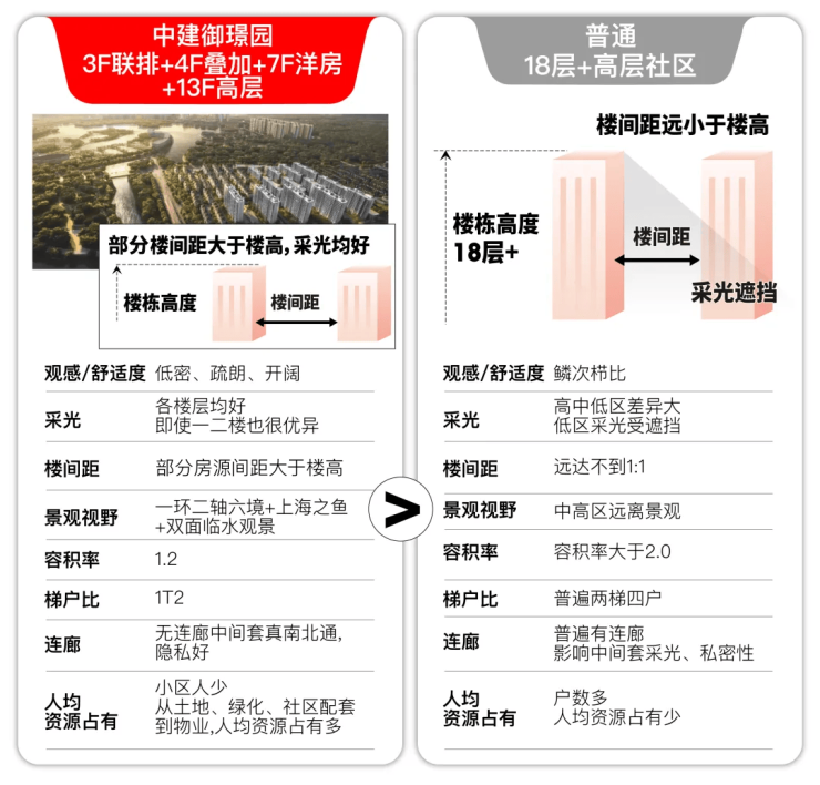 而中建御璟园不仅是这稀缺的低密住区之一,得益于其叠墅+联排+小高层+洋房的产品组成, 项目的宜居性、视野、采光、人均资源占有率以及居住舒适度等全维度的表现都非常出众。