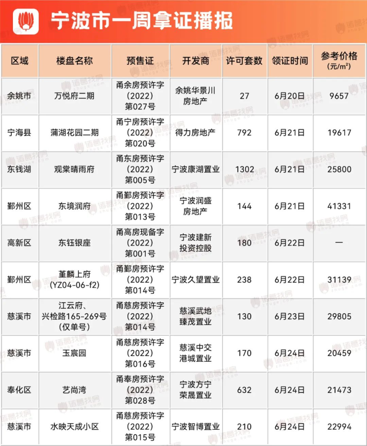 本周宁波大市共10个楼盘取得许可证,入市房源共计3825套,其中市六区共计2496套 。