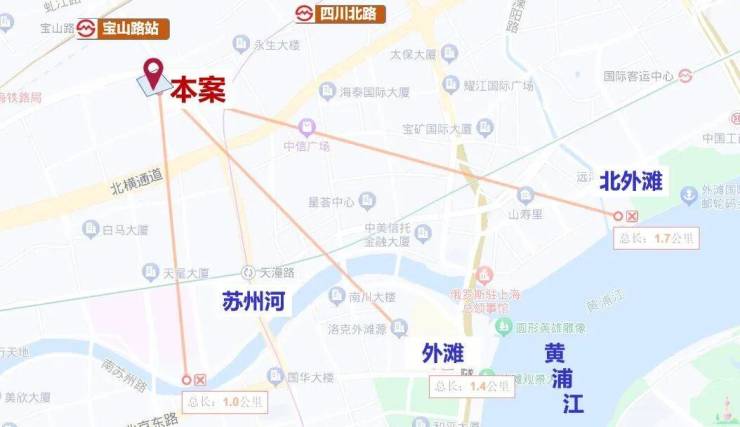 仅从图上看,该地块直线距苏州河约1公里,直线距外滩约1.4公里,直线距北外滩约1.7公里,直线距3/4号线宝山路站约300米,直线距10号线四川北路站约560米,区位优势明显。