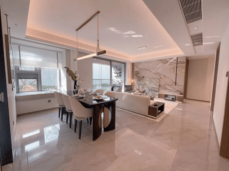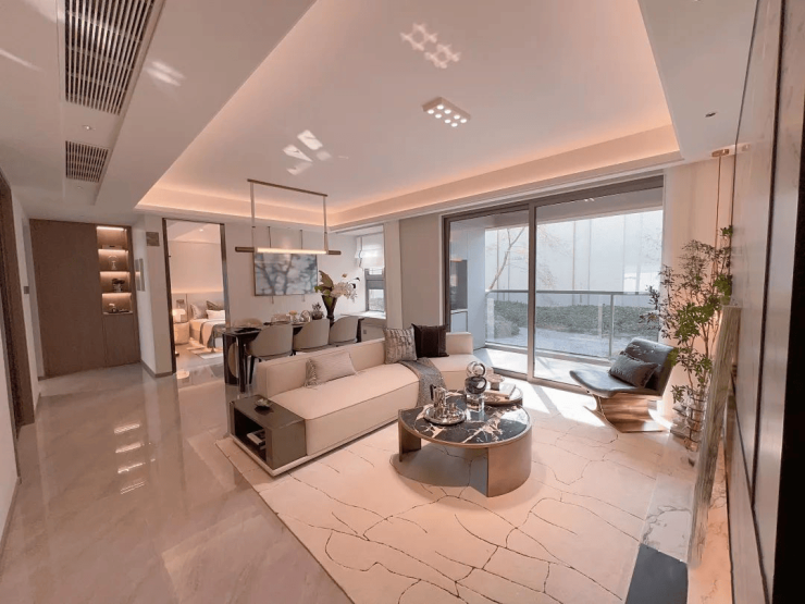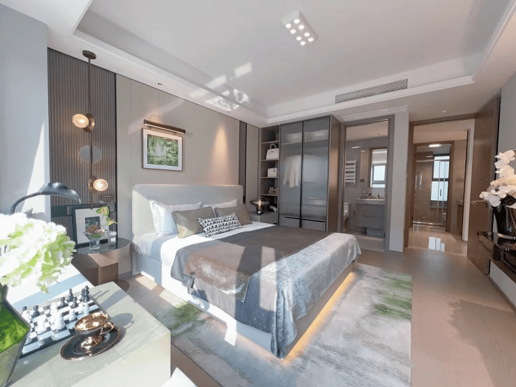交付标准:精装交付,配备东芝中央空调、中科睿赛新风系统、威能地暖三大件;厨房配置老板烟灶、12件套洗碗机、摩恩水槽龙头;卫浴采用科勒洁具,全屋定制收纳系统