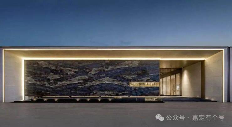 立面通过简洁的横向构图,大面积玻璃运用,呈现通透的光感效果,强调室内室外空间的融合、让建筑与景观互相呼应。局部金属线条装饰点缀,在光影的折射下,呈现出时间淬炼的美妙观感,映见轻盈雅致的艺术品位。