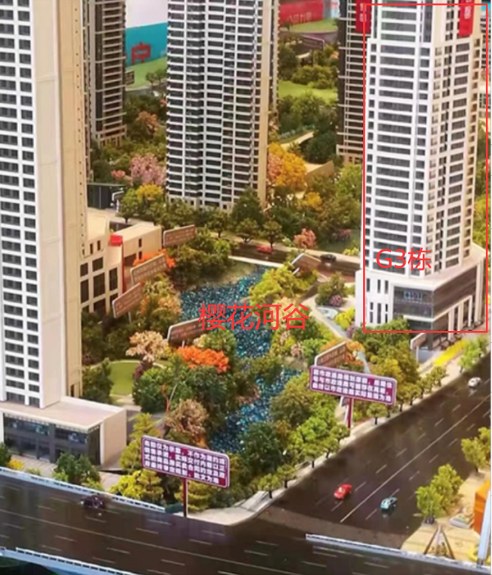 购房人徐辉称,开发商的宣传、沙盘均显示华润•公园九里G组团为闭合小区,最右侧为G3栋楼。图片来源 受访者供图