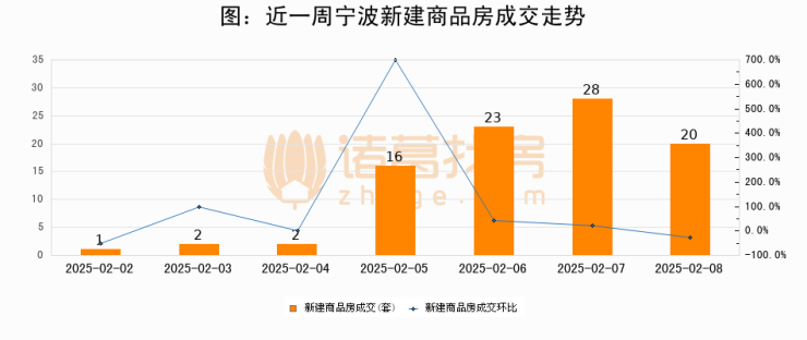 根据宁波市房产市场管理中心数据显示,2025年02月08日宁波新建商品房成交20套,较昨日减少8套,环比下降28.6%。近一周宁波新建商品房日均成交14套。02月08日单日成交20套,高于近一周平均水平42.9%。