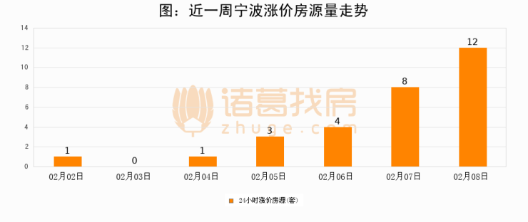 根据诸葛找房数据显示,宁波24小时涨价房源量为12套,较02月07日增加4套,环比上涨50%。与此同时,涨价房源占比小幅扩大,业主信心有所提升。