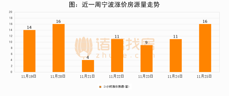 根据诸葛找房数据显示,宁波24小时涨价房源量为16套,较11月24日增加5套,环比上涨45.5%。与此同时,涨价房源占比小幅扩大,业主信心有所提升。
