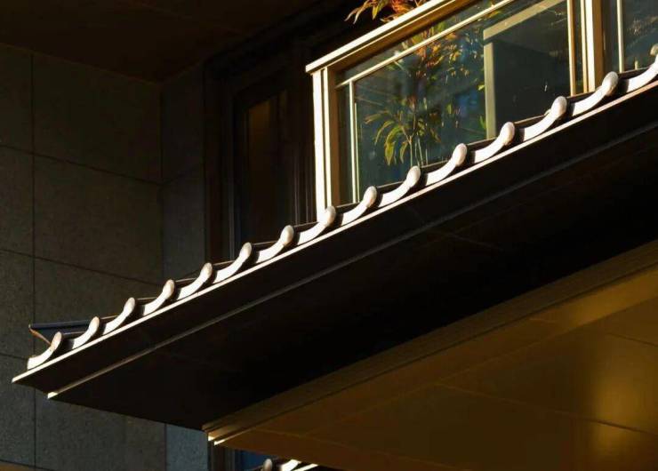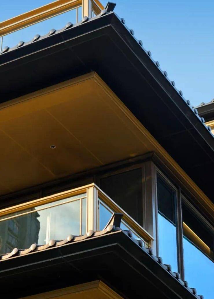 三重屋檐,代表天地人融合的东方宫殿最高等级,上檐、外檐、下檐三重结构,现代立面,以铝板、格栅、石材、瓦墙型材、玻璃等现代型材,彰显传世之宅的独特气度。