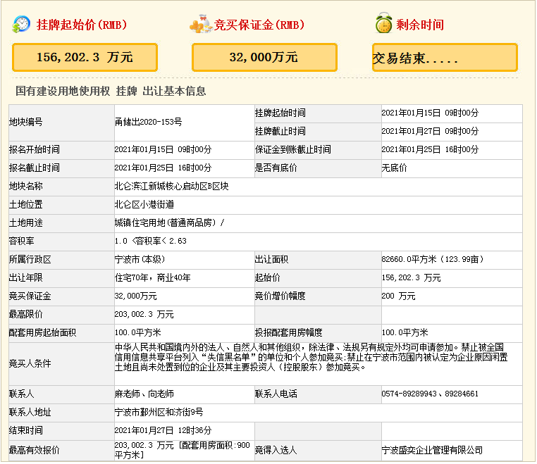 本地块采用“限房价、限地价、竞配建”方式出让,该地块商品住宅毛坯销售均价不高于19500元/平方米,商品住宅毛坯较高销售单价不高于21450元/平方米,车位较高销售价格不超过20万元/个。当竞买报价达到203002.3万元时,不再接受更高报价,转入竞报人才安居专用房程序,并按投报面积较高者确定竞得人。竞配人才安居专用房起始面积为100平方米,以后每次增加面积为100平方米或100平方米的整数倍。竞配的人才安居专用房(含人才安居专用房对应比例的停车位)按照《宁波市人才安居专用房筹集管理办法(试行)》无偿移交政府代持机构。