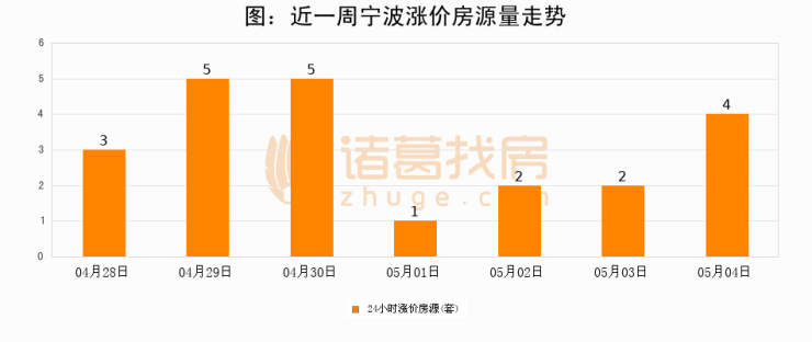 根据诸葛找房数据显示,宁波24小时涨价房源量为4套,较05月03日增加2套,环比上涨100%。与此同时,涨价房源占比小幅扩大,业主信心有所提升。