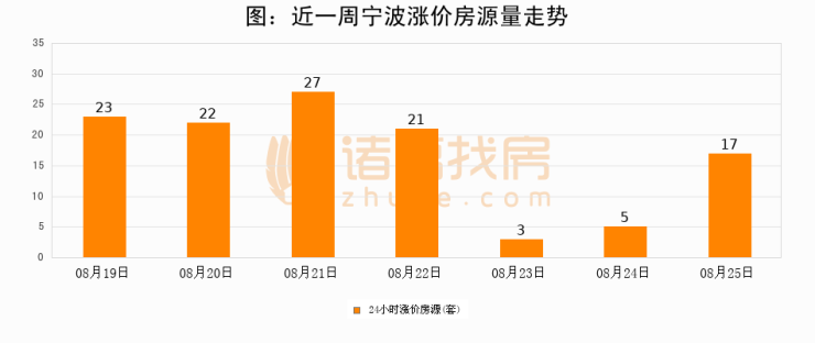 根据诸葛找房数据显示,宁波24小时涨价房源量为17套,较08月24日增加12套,环比上涨240%。与此同时,涨价房源占比小幅扩大,业主信心有所提升。