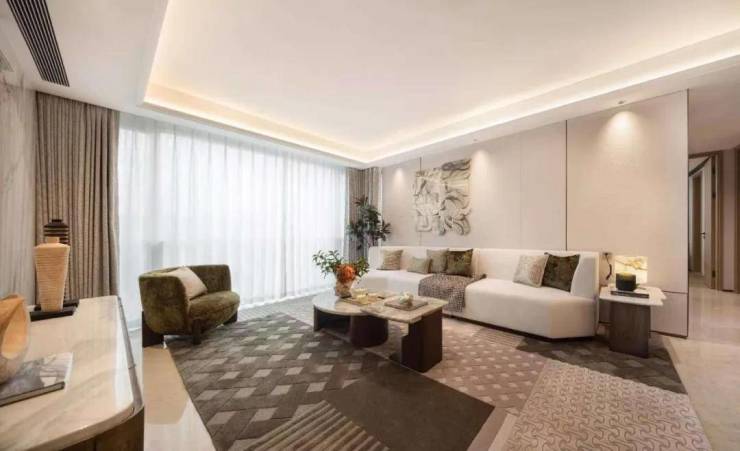 示范区建筑体采用的是米白色的莱姆石镶嵌超大玻璃,莱姆石在阳光的照耀下仔细一看有母贝的光泽效果。把光影作为设计语言引入,让建筑显得纯净,却又不失现代感。