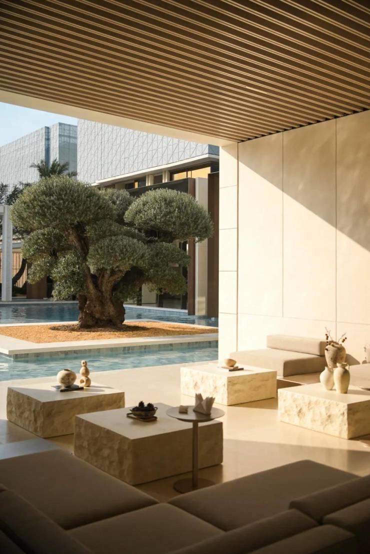 它将行政酒廊与砾石花园自然衔接,又以无边观景平台延展至下层会客空间,营造出纯净而优雅的高差漫游体验,让行进的每一步皆成风景的延续。