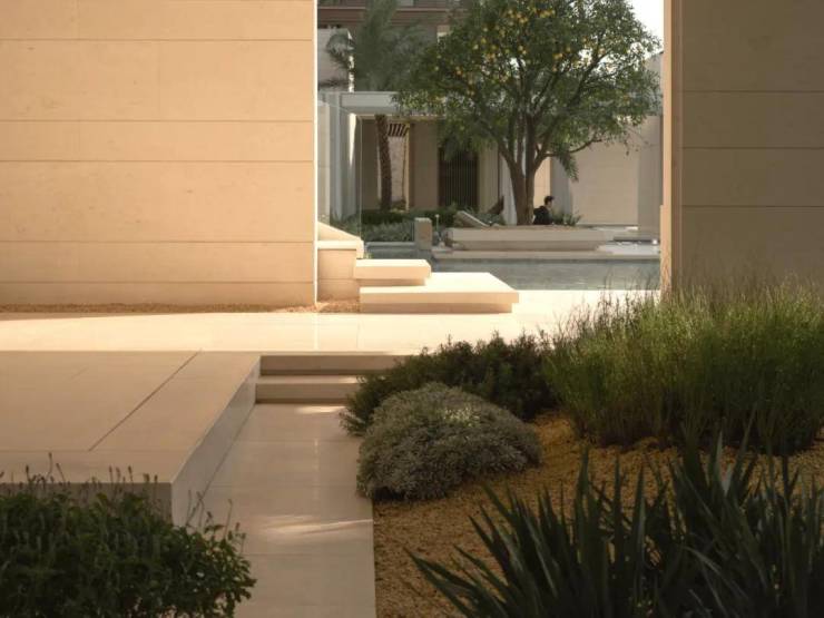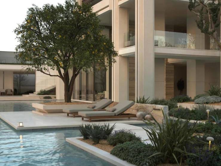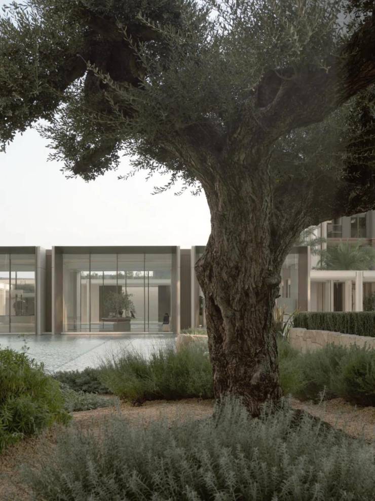 作为首个度假风情的住区,璟逸汲取希腊安缦酒店与Gundari度假村的精髓。素雅的米白石壁墙引领访客,穿行于水院与连廊之间,步入白色莱姆石建筑群,冰蓝水面与沙生植物交织的闲适景致,仿佛将圣托里尼的暖阳拥入怀中。