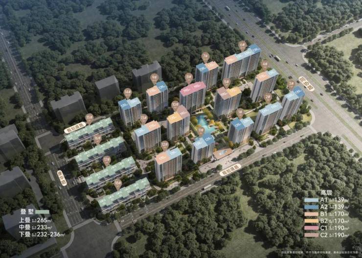 14幢13-15层小高层395户(全2梯2户)+4幢叠墅72户,高低配,总套数467户。高层户型139、170、190方,架空层5-8米,高层户内3.1米层高;叠墅户型232-260方。