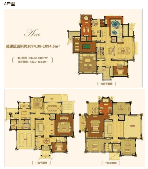 A 户型(金轩):约 1074–1094㎡,6 房以上(带双首层 / 泳池)