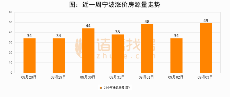 根据诸葛找房数据显示,宁波24小时涨价房源量为49套,较09月02日增加15套,环比上涨44.1%。与此同时,涨价房源占比小幅扩大,业主信心有所提升。