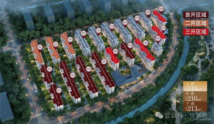 在售户型面积 :主力户型为建面约212-218㎡精装叠墅,包含上、中、下三种叠墅类型