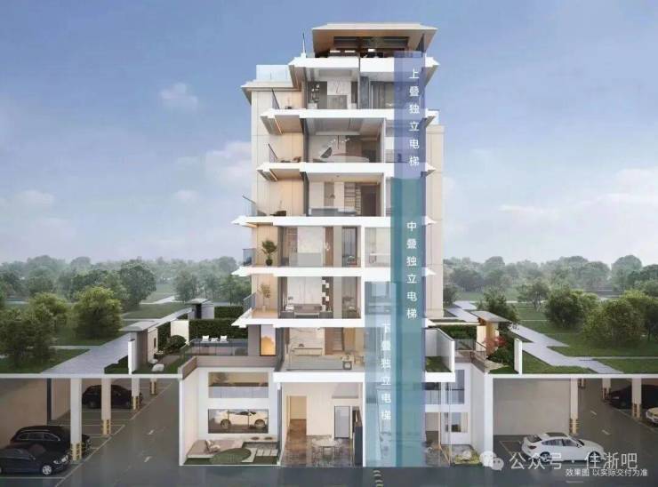 独立入户设计 :上、中、下叠均配备独立电梯与入户庭院,保障居住私密性,媲美独栋别墅体验