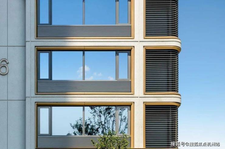 在外立面上,项目 南向铝板、局部金属格栅、部分涂料 等,还是 经典9号库金色 ,同源滨江海岸系的金色铝板,颜值较高。