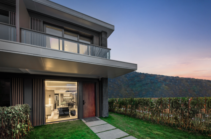 玖珑湾的住宅产品由洋房和立体合院组成。极简的建筑线条搭配大面积的玻璃,轻盈剔透,与蓊郁山林交融为一体,天然美得像建筑杂志里的时尚大宅。