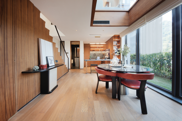 餐客厅和主卧套房都拥有约4.5米的大面宽,搭配整面落地大玻璃,将更多光影纳入室内,琉璃山色就是悬在窗前的四季大片。