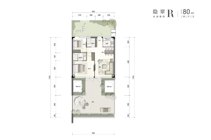 建面约80㎡的户型,北向庭院入户,南向约9米双开间,拥有两室两厅两卫的空间布局。