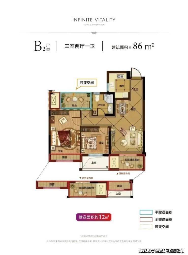 【86㎡户型】建筑面积约86㎡的两室两厅一厨一厅户型,可变空间充裕,北面的阳台稍作改装就能变成书房,这样一来就是非常标准的“小三房”。