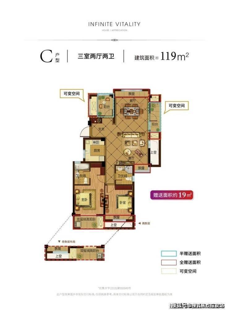 【119㎡户型】当然,也有供刚需购房者“一步到位”的三房户型——119㎡,其中可变空间也有约19㎡。