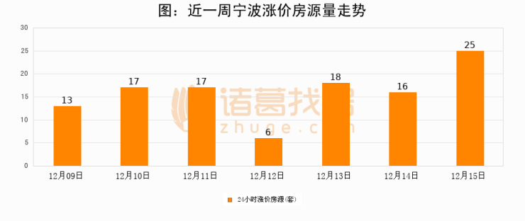 根据诸葛找房数据显示,宁波24小时涨价房源量为25套,较12月14日增加9套,环比上涨56.2%。与此同时,涨价房源占比小幅扩大,业主信心有所提升。