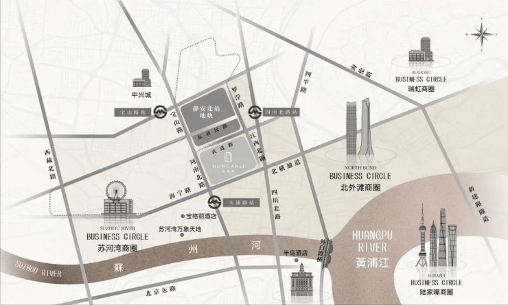 仅从图上看,该地块直线距苏州河约1公里,直线距外滩约1.4公里,直线距北外滩约1.7公里,直线距3/4号线宝山路站约300米,直线距10号线四川北路站约560米,区位优势明显。