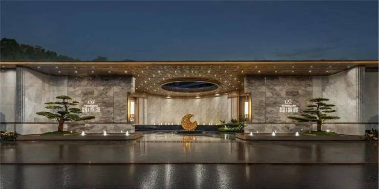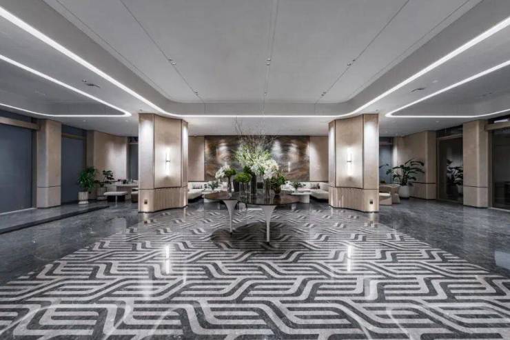 以星级精奢酒店门庭为美学蓝本,匠造约50米超长气质门庭,大尺度平顶屋檐,对称式布局,营造高端住区的庄严;卡慕白奢石景墙与罗汉松相映成韵,令尊崇在无声处彰显。