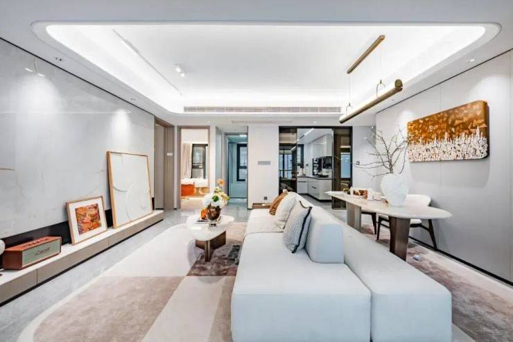 大尺寸地砖铺陈于地面,灵动弧形吊顶与岩板背景墙结合,营造层次丰盈的美学格调。
