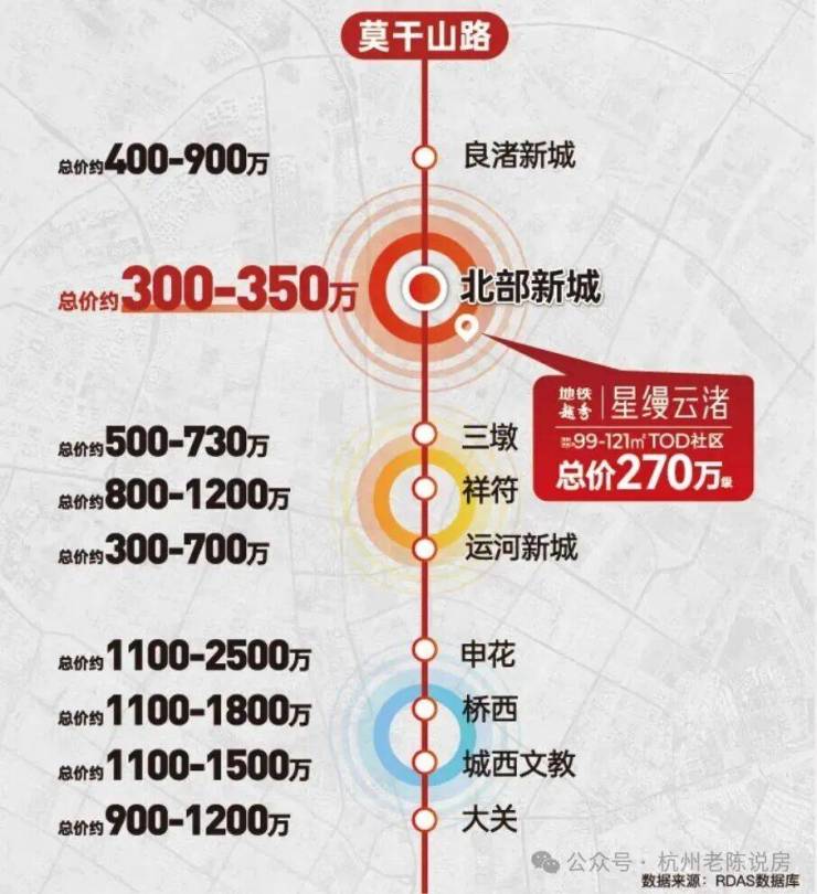 莫干山路沿线改善级产品总价已为800-2000万级;北部新城板块内总价约为300-350万,同为莫干山路沿线,且为北部新城板块内仅有全配套TOD大盘,星缦云渚总价仅约270万级,价差红利明显,还需即刻抢定。