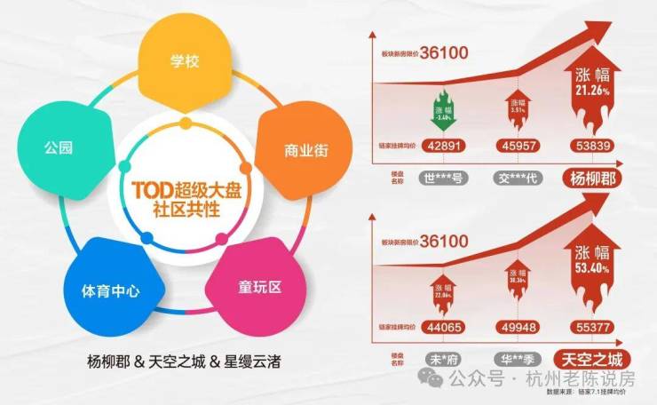 且从市场表现看,以杨柳郡目前挂牌价53839元/㎡,所在板块新房限价44400元/㎡;天空之城挂牌价55377元/㎡,所在板块新房限价36100元/㎡(数据来源:链家7.1挂牌均价),自带配套大社区溢价相较普通社区更具长线优势。