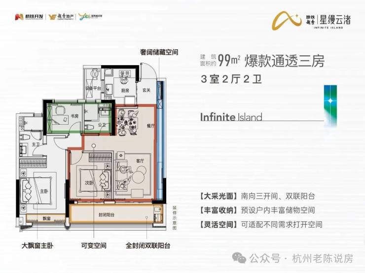 •更大采光面:南向三开间、双联阳台;