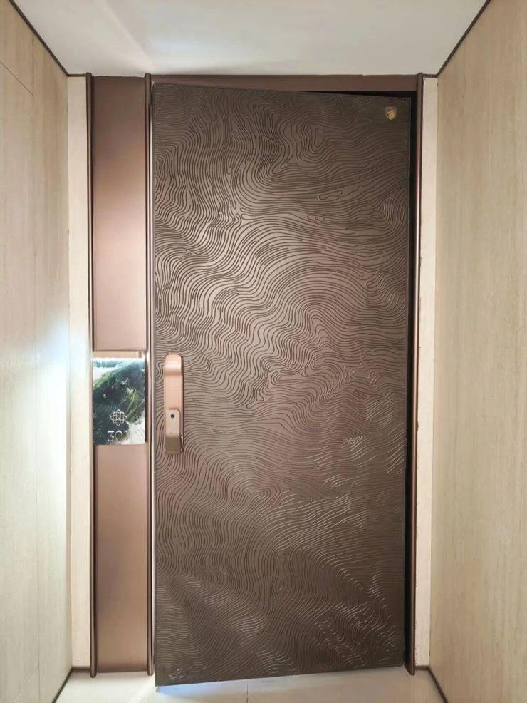 回归大家最关心的室内,品质一如既往,铝雕钢质门先声夺人,波浪状的金属纹路高级感满满,搭配日本松下多功能电子锁,保证了足够的安全性和私密性。
