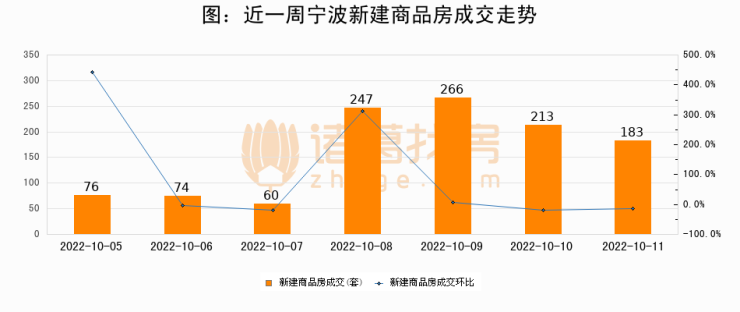 根据宁波市房产市场管理中心数据显示,2022年10月11日宁波新建商品房成交183套,较昨日减少30套,环比下降14.1%