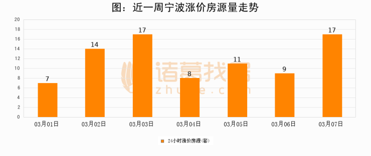 根据诸葛找房数据显示,宁波24小时涨价房源量为17套,较03月06日增加8套,环比上涨88.9%。与此同时,涨价房源占比小幅扩大,业主信心有所提升。