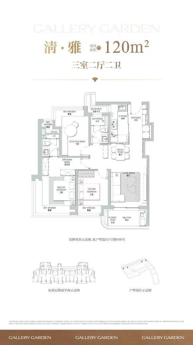 约120㎡ 三房两厅两卫:四开间朝南,客厅面宽≥5.2米,总价约1350万起
