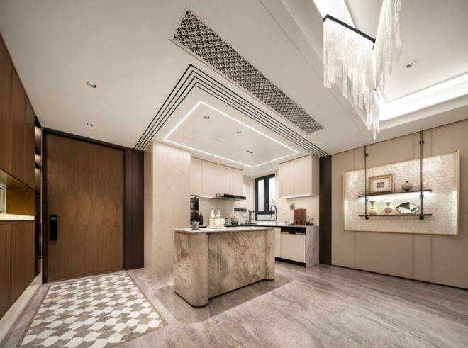 玄关位置地面采用石材,个性化的logo拼花,尊崇感十足,配合定制玄关柜,柜内交付有除臭精灵,功能性与颜值,双双拉满。