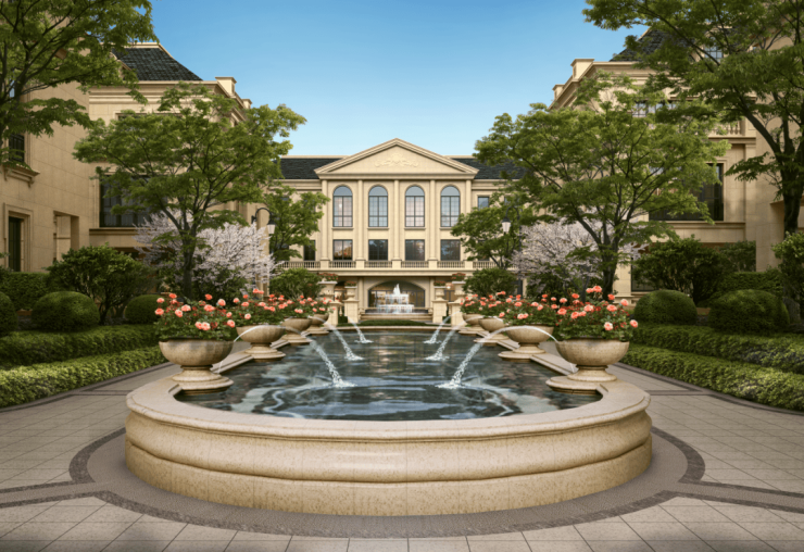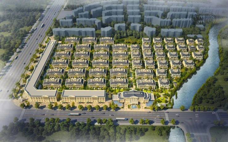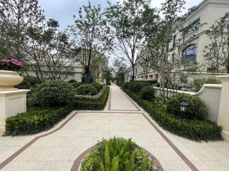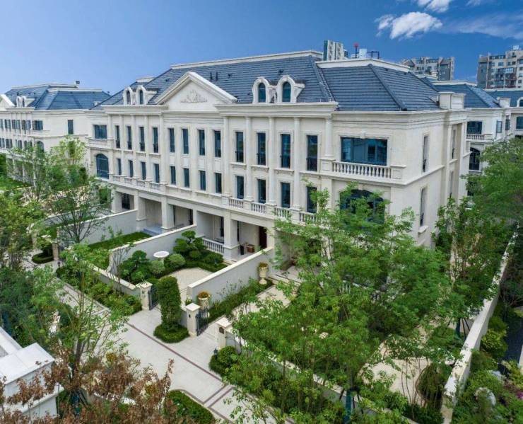 整个园区,以经典的绿城法式墅区景观大中轴贯穿,占地约1000多㎡,联排建筑的设计,融合了中国传统院落布局与法国枫丹白露宫的审美,外立面大面积采用全石材干挂,檐口等细节部位使用仿石。