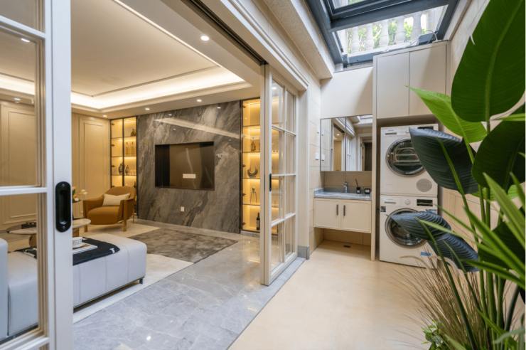 除了庭院,还有私享地下空间,大面的采光井带来明亮的视觉感受,可以在这里看个电影,或和朋友品茗畅谈。哪怕下雨,呆在这样的空间内也会感受到满满的安全感。
