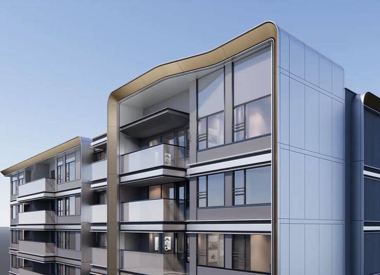 一园三堂的归家动线,象征着东方人文礼序。建筑风格造型,灵感源自金镶玉设计,提取其“曲”的形和白金配色应用到塔楼立面上,彰显项目的温和雅丽与尊贵典雅。