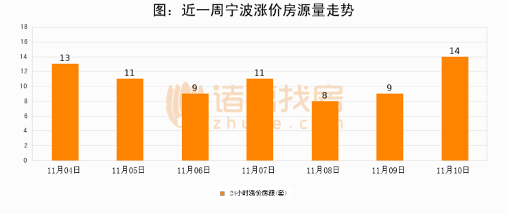 根据诸葛找房数据显示,宁波24小时涨价房源量为14套,较11月09日增加5套,环比上涨55.6%。与此同时,涨价房源占比小幅扩大,业主信心有所提升。