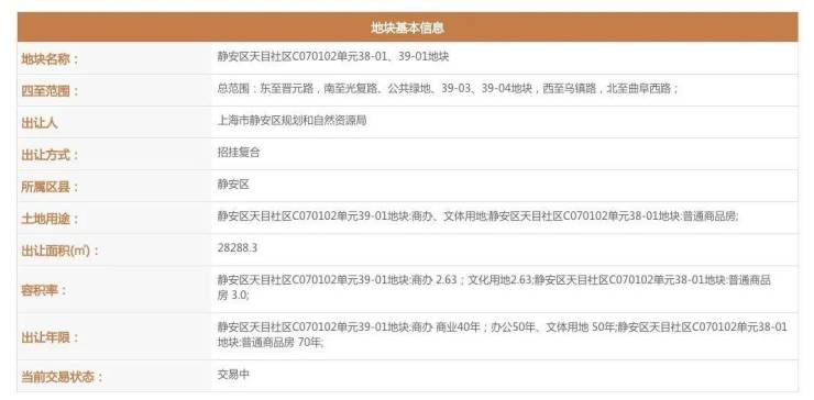 2020年10月,仁恒+华发联合体以42.1亿的价格竞得静安区天目社区,C070102单元38-01、39-01地块,溢价率为1.25%,成交楼面价52833.79元/㎡!