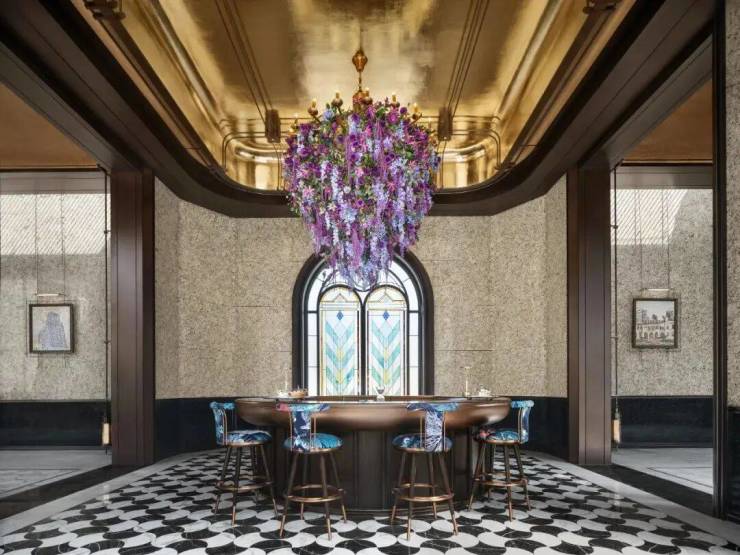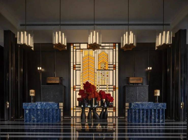 其次,项目的很多细节都融入了海派经典元素,比如落客区美轮美奂的约300㎡彩色玻璃穹顶,艺术连廊拱形廊道灵感都来自和平饭店。彩绘花窗的拱门造型则取自武康大楼。