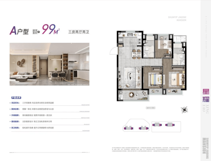 建面约99㎡的三房两厅两卫,很适合一家三口的上车的作品。三开间朝南,南北通透,动静分区,